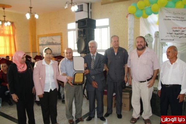 وفي نهاية الحفل تم تكريم المتفوقين من الطلبة الأولى ضمن الطلبة هي الطالبة ريا مأمون حميد والحاصلة على معدل 98.1 والثانية عائشة رمزي ربيع والحاصلة على معدل 97.9 وقد بلغ عدد الناجحين في الثانوية العامة 63 طالب وطالبه .وقد بلغت قيمه التكريم 12 ألف دولار أمريكي موزعه حسب الدرجات العلمية التي حصل عليها ألطلبه . كما تم توزيع الدروع على خريجي الجامعات من طلبة الدراسات العليا والبكالوريوس والدبلوم