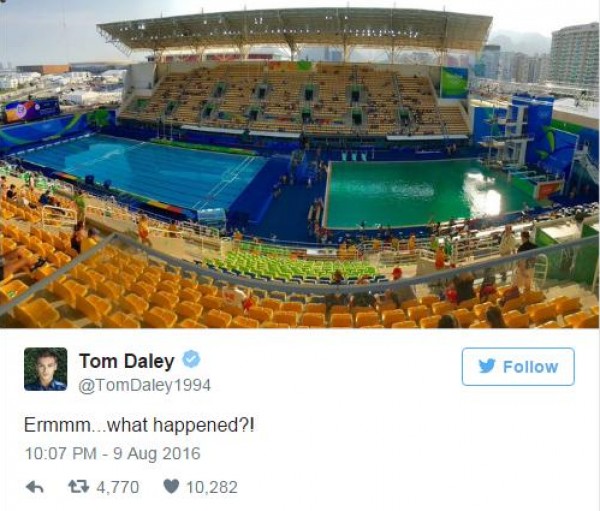 البداية كانت من خلال تغريدة لبطل السباحة البريطاني توم دالاي، تساءل فيها ماذا حدث أتبعها بصورة حوض السباحة الأزرق والأخضر.
