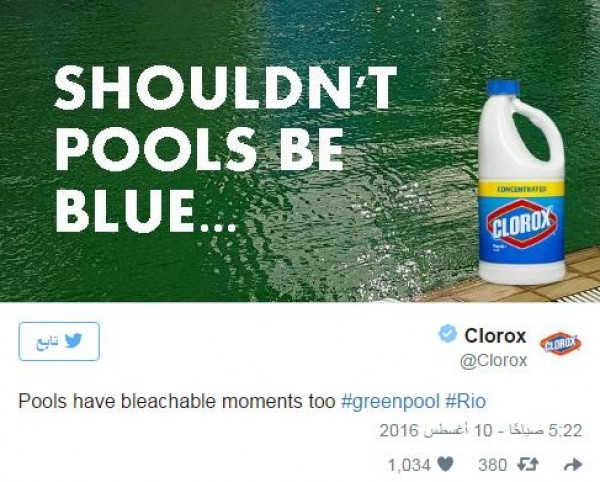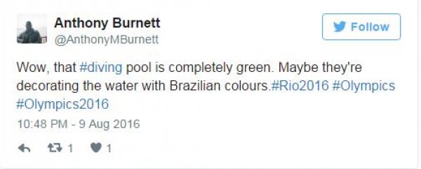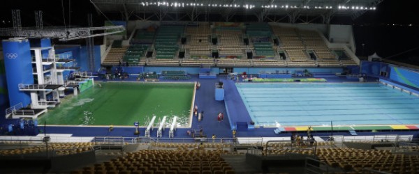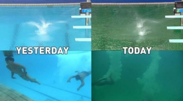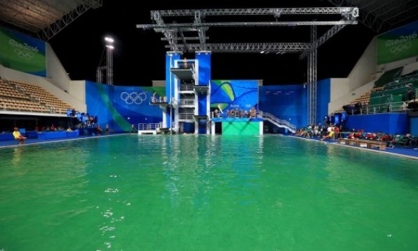 الشيء الذي لاحظه آلاف المتابعين للأولمبياد هو تغير لون المياه في أحواض السباحة من الأزرق في بداية المنافسات الى الأخضر خلال سباقات الثلاثاء 9 أغسطس/آب 2016.