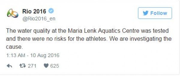 كما نشرت الصفحة الرسمية لدورة ريو دي جانيرو عبر تويتر تأكيداً أنه تم فحص المياه ولا يوجد خطر على الرياضيين.