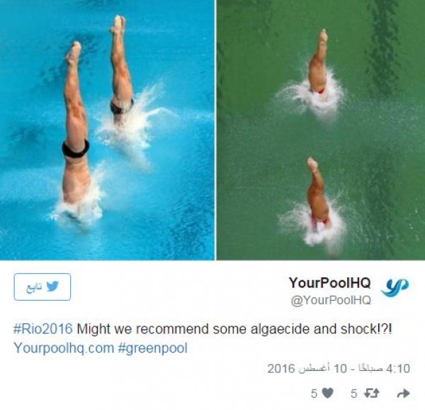 أحد المسؤولين الرسميين في الأولمبياد صرّح - بحسب Independent البريطانية - بأنه لا يعلم سر تحول المسبح للون الأخضر، لكن مع ذلك لا شيء يدعو للقلق وسيتم معالجة الأمر بشكل عاجل.