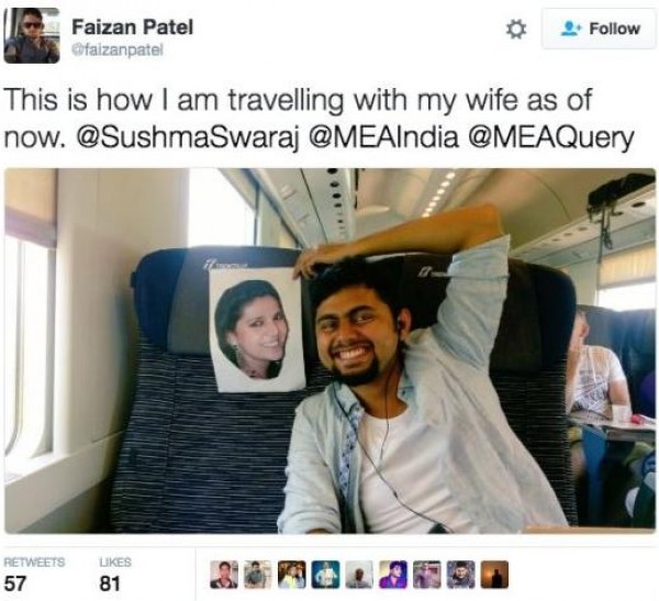 اصطحب فايزان صورة زوجته أينما ذهب خلال رحلته، وبعد اقتراح أحد الأصدقاء له، قام الزوج بالتغريد لوزيرة الخارجية الهندية، سوشما سواراج، على أمل مساعدته، والتي بالمناسبة لم يكن من محبيها من قبل.