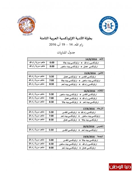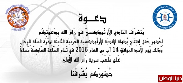 وصل اليوم و فد نادي ارثوذكسي عمان إلى فلسطين للمشاركة في بطولة الاندية الارثوذكسية العربية الثامنة لكرة السلة للرجال والتي يستضيفها نادي ارثوذكسي رام الله وبإشراف الإتحاد الفلسطيني لكرة السلة وبمشاركة ستة فرق وهي فريق ارثوذكسي عمان الأردني وفريق ارثوذكسي القدس - والمشارك لأول مرة - وفريق ارثوذكسي بيت لحم وفريق أرثوذكسي بيت جالا وفريق ارثوذكسي بيت ساحور بالإضافة إلى فريق ارثوذكسي رام الله المستضيف،