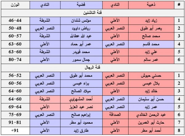 | # | ذهبية | النادي | فضية | النادي | الوزن |