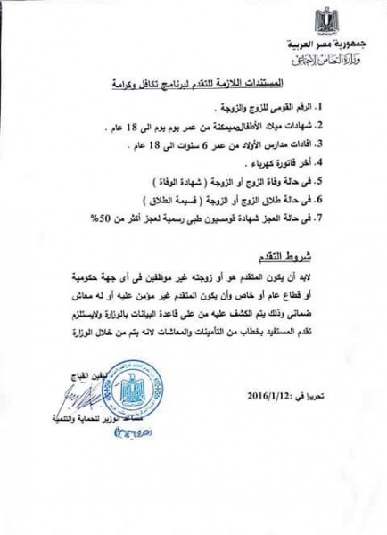 رصدت منظمة العدل والتنمية خطاب صادر من وزارة التضامن الاجتماعى ينص على شروط منح معاشات تكافل وكرامة للمتقدمين للحصول على المعاش وهى ان يكون المتقدم وزوجته غير موظفين بالقطاع العام او الخاص او الحكومة وان يكون غير مؤمن عليه والا يكون له معاش ضمانى ويتم الكشف عنه عبر قاعدة بيانات الوزارة ورغم ذلك حصل الاف المواطنين غير المستحقين للمعاش على تكافل وكرامة بمحافظات الاقصر وقنا وبنى سويف واسيوط وسوهاج والمنيا وتجاهلت الوزارة التحقيق بالواقعة او تشكيل لجان تحقيق لفحص ملفات المتقدمين اليها والتى تتم كتابتها من قبل موظفى الشئون الاجتماعية قبل تسليمها للوزارة