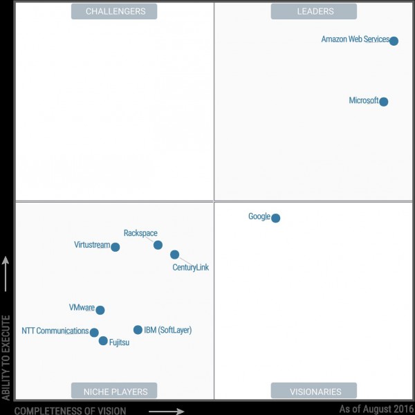 اختارت شركة غارتنر للأبحاث للسنة الثالثة على التوالي مايكروسوفت كشركة رائدة في تقرير ماجيك كوادرانت لمزودي خدمة البنية التحتية السحابية ، وهو تقرير سنوي لتقييم مقدمي خدمة البنية التحتية السحابية استنادًا إلى اكتمال الرؤية والقدرة على التنفيذ.