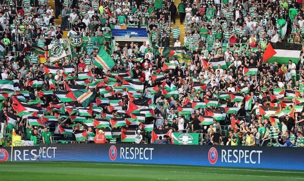 رفع مشجعو نادي سلتيك الأسكتلندي، الأعلام الفلسطينية قبل انطلاق مباراة فريقهم مع نظيره الإسرائيلي هبوعيل بئر السبع الإسرائيلي، في ذهاب المرحلة المؤهلة للمجموعات ببطولة دوري أبطال أوروبا لكرة القدم.
