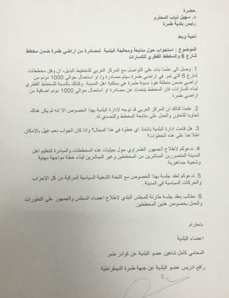 قام اليوم الأربعاء عضوا البلدية كامل شاهين كوادر طمرة ورافع إدريس جبهة طمرة الدمقراطية بتقديم استجواب لرئيس بلدية طمرة د. سهيل ذياب حول إمكانيات مصادرة حوالي 2000 دونم من أراضي خاصة في طمرة لصالح تنفيذ شارع 6 القطري والمخطط القطري لبناء الكسارات.