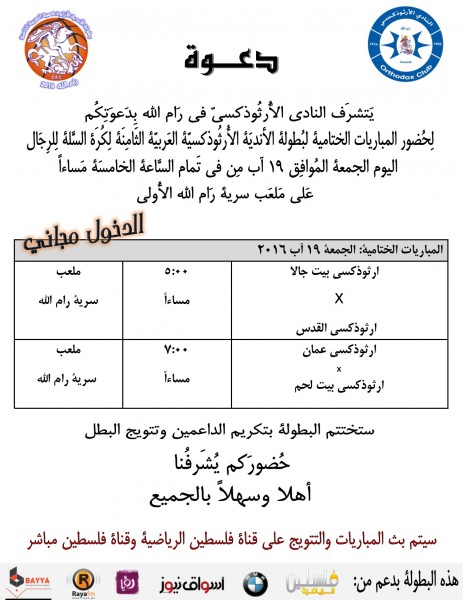 وكانت اختتمت الجمعة البطولة الارثوذكسية الثامنة بكرة السلة على صالة السرية بحضور شخصيات اعتبارية ورياضية ومن بينها رئيس اتحاد كرة السلة خضر دياب والامين العام عزيز طينة ومدير الاعلام باللجنة الاولمبية بدر مكي ورئيس ارثوذكسي رام الله هاني الحصري ورؤساء الاندية المشاركة حيث شاركوا جميعا بالتتويج.