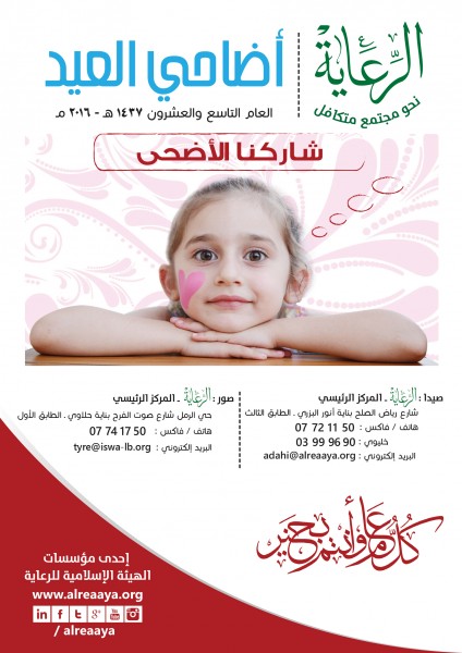 وتدعو الرعاية أهل الخير عامةً وصيدا خاصةً الى أوسع مشاركة في مشروع أضاحي العيد لهذا العام مؤازرة لأهل المدينة من الفقراء والمحتاجين.