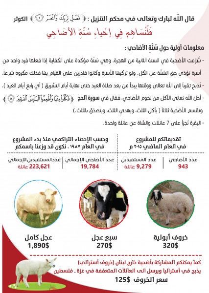 أطلقت الرعاية – إحدى مؤسسات الهيئة الإسلامية للرعاية مشروع أضاحي العيد للعام 2016 تحت شعار "شاركنا الأضحى" إحياءاً لسنة الأضاحي وتطبيقاً لشريعة الدين الإسلامي الحنيف عملاً بقوله تعالى في كتابه الكريم "فَصَلِّ لِرَبِّكَ وَانْحَرْ" صدق الله العظيم.