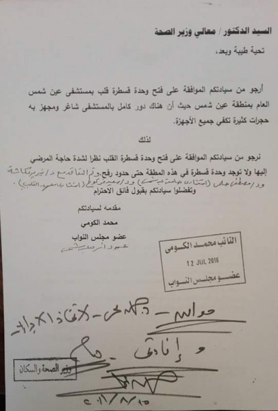 قدم النائب محمد الكومي عضو مجلس النواب عن دائرة عين شمس بحزب المصريين الأحرار، الطلب الموقع عليه الدكتور احمد عماد الدين وزير الصحة، بعمل وحدةقسطرة قلب بمستشفى عين شمس العام، تكون هدفها خدمة مرضي القلب بدائرة عين شمس والمناطق المجاورة.