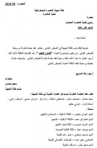 واكدت الكتلة في رسالتها على ضرورة بحث ظاهرة العنف وتفشيها معتبرة اياها واحدة من ابرز القضايا المقلقة لاهل المدينة. وطلبت الكتلة اعتبار مطلبها لعقد جلسة طارئة، رسميا وتوجيه دعوات خطية ورسمية لكافة أعضاء المجلس البلدي .