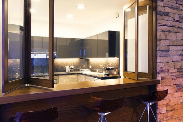 أما المطبخ فتم تصميمه بخطوط بسيطة ليحتضن خزائن علوية لامعة بالأسود، وسفلية فاتحة بلون الخشب يفصلهما سطح من «الكورين» الأسود مع مغسلة كبيرة، ويفصل ما بينهما جدار وسطي تلفّه إنارة خافتة.