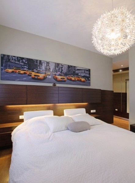 أسوة بالغرف الأخرى، جُعلت الأسرّة في غرفة النوم الرئيسة ملاصقة للجدار، وتميزت باللونين الأزرق والبيج مع خزائن بلون خشب الجوز. زُنّرت الجدران في الوسط بخط باللون الأزرق، فبدا فاصلاً بين قسمين علوي لُبّس بالخشب، وسفلي غُلّف بالجلد، وعند الأطراف توزعت منضدتان بلوني البني والخشب الطبيعي... وفي هذه الغرفة، طغت المرايا على واجهات الخزائن، لتعكس الضوء المتسلل من الخارج، وتُبعد عن المالكين الشعور بالممل.