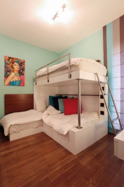 وفي غرفة نوم أخرى، وبسبب ضيق المساحة، وُضع سرير أبيض مؤلف من طابقين، وفُضّل طلاء أحد الجدران باللون الأخضر الذي يرمز الى التجدد والحياة.