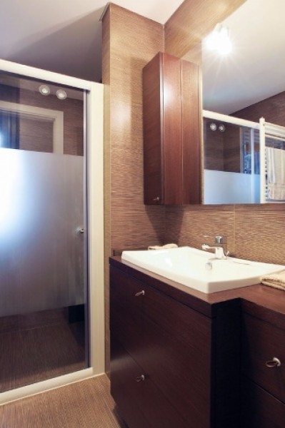 أما الحمامات فتناسقت ألوانها مع ألوان الغرف، وتوحدت المغاسل باللون الأبيض، والجدران باللون الرمادي لتتناغم مع أعمال الخشب التي برزت بألوان الابيض والأزرق والأخضر ضمن خطوط هندسية ناعمة، تحاكي سحر الباركيه أرضاً، والذي أضفت الخطوط الفنية المتداخلة فيه لمسات فريدة على المكان.