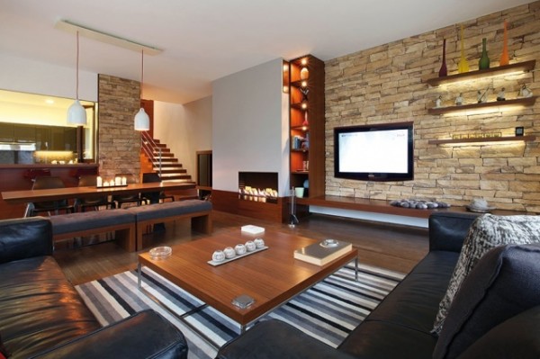 وتماشياً مع أجواء «الشاليهات» النابضة بالحياة، توزعت في ركن الجلوس كنبتان من الجلد الاسود، وطاولة بدا تصميمها نادراً. وتحول الجدار الحجري الى لوحة بعدما استند إليه تلفاز ضخم، وانبثقت منه رفوف احتوت قطعاً من الأكسسوارات الملونة. وفرضت المدفأة حضورها على المكان، بلونها الرمادي الفاتح مع تجويفات خشبية مضاءة باللون البرتقالي.