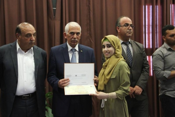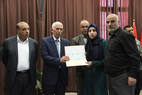 وفي كلمة المتفوقين شكرت الطالبة ندين الهشلمون الرئيس ومحافظ الخليل على هذه اللفتة الداعمة لهم والتي تؤكد حرص القيادة دوما على دعم العملية التعليمية والطلبة المتفوقين لانهم امل المستقبل مؤكدة ان كافة الناجحين سيكونوا عند حسن الظن في خدمة وطنهم في كافة التخصصات والمجالات .