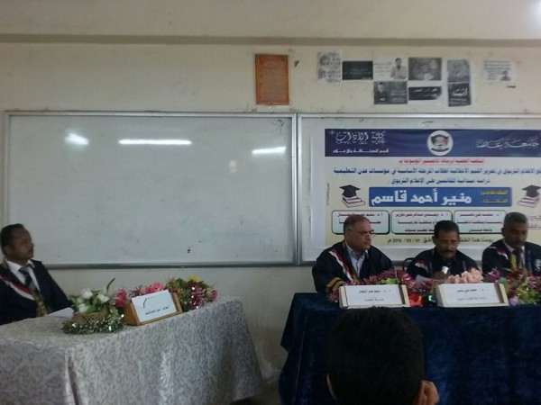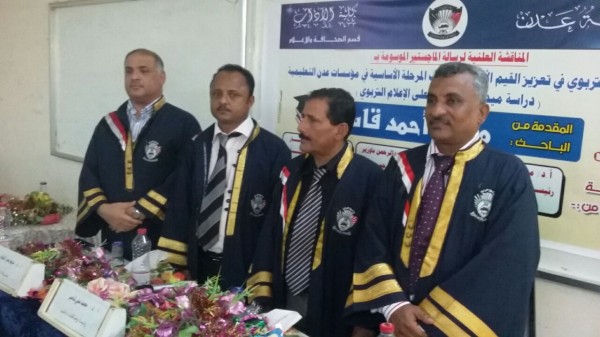 منحت جامعة عدن درجة الماجستير بامتياز للطالب / منير أحمد قاسم ناجي من قسم الصحافة والإعلام عن رسالته الموسومة بـ(واقع الإعلام التربوي في تعزيز القيم الأخلاقية لطلاب المرحلة الأساسية ، في مؤسسات عدن التربوية التعليمية".