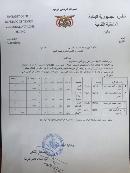 بالإشارة الي الموضوع اعلاه فأننا طلاب التبادل الثقافي للعام ٢٠١٥-٢٠١٦ م عدد (4) طلاب حصلنا على منح التبادل الثقافي في الصين والتحقنا بجامعاتنا في شهر سبتمبر من العام ٢٠١٥م واستوفينا كل متطلباتنا في شهر اكتوبر من نفس العام واخذ منا صياغه قرار الابتعاث في التعليم العالي مدة شهرين مضنيه من المتابعة لصياغه قرار الابتعاث واصداره ورغم ان التأخير كان بسبب الوزارة الا انه لم يتم احتساب الربع الرابع لعام ٢٠١٥م وتم ابلاغنا بانه لا يمكن استعاضت هذا الربع رغم استحقاقنا له وانه سوف يتم تعزيز مستحقاتنا للربع الاول وبعد انتظار طويل وصلت اسمائنا الي السفارة ولكن كان هناك توجيهات بتوقيفها في السفارة إلي حين إرسال رساله تأكيديه من الجامعة بانتظام الطلاب بالدراسة والتي وللعلم تم ارسالها بداية شهر سبتمبر مباشرتا وسارعنا باستصدار رساله اخرى من الجامعة تعزز الرسالة الاولى والامل يحذونا باستلام مستحقاتنا لنتفاجأ بقول السفارة انه لا توجد مبالغ واستمر الاخذ والرد وقيل لنا ليس هناك داعي للقلق سوف نقوم بصرف مستحقات الربع الاول والثاني معاً. ونظرا لكون معاملتنا قانونيه .