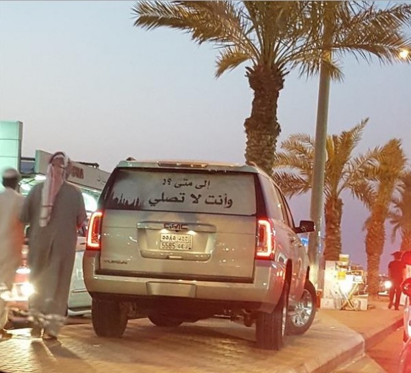 لكن العبارة جاءت مختلفة عن العبارات المألوفة للتنبيه على حق الصلاة، حيث كتب على خلفية السيارة “إلى متى وأنت لا تصلي؟”.