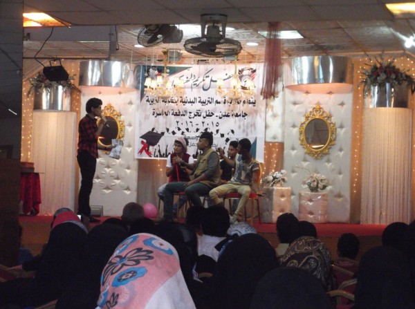 وأشار رئيس اللجنة التنظيمية للحفل/معاذ أحمد إلى أنها المرة الأولى التي يُقام فيها حفل تخرج بشكل رسمي لطلاب القسم – مساق البكالوريوس، وقال: "حظيت ترتيبات الحفل باهتمام ودعم معنوي ومادي من قبل إدارة وأساتذة القسم، وحرصت اللجنة التنظيمية على أن يكون في الوقت والمكان المناسبين"، بدورها أوضحت الطالبة/مارينا فهمي – رئيس اتحاد كرة السلة النسوي بعدن: "إلى جانب التحصيل العلمي كان لطلاب الدفعة من الجنسين العديد من الأنشطة والفعاليات الرياضية في مدارس وجامعات عدن، شارك فيها أيضاً طلاب وطالبات من مختلف المستويات الدراسية بالقسم، تضمنت مسابقات ودورات رياضية لاستيعاب الطاقات الرياضية والهواة، لا سيما النسوية".