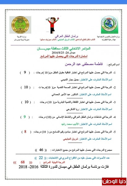 شهدت انتخابات برلمان الطفل العراقي الدورة الثالثة 2016 – 2018 وللمرة الأولى في الوطن العربي اختبار ((الصحة النفسية)) من قبل الدكتور عبد الأمير الحمداني (اختصاص نفسية) واختبار ((مبادئ وقيم التسامح)) من قبل النائبة شروق العبايجي