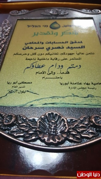 مياه الجليل تكرم المحامي نصري سرحان بمناسبة إنهاء عمله كمراقب داخلي للشركة