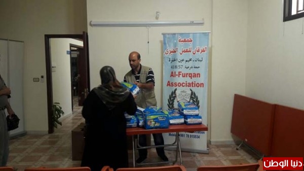 واصلت جمعية الفرقان للعمل الخيري في جنوب لبنان اهتمامها بالنازحين من سوريا الى مخيم عين الحلوة في الجنوب اللبناني من خلال توزيع المساعدات الغذائية والصحية وغيرها فقامت بتوزيع كمية من الحفاضات للأطفال الحديثي الولادة .