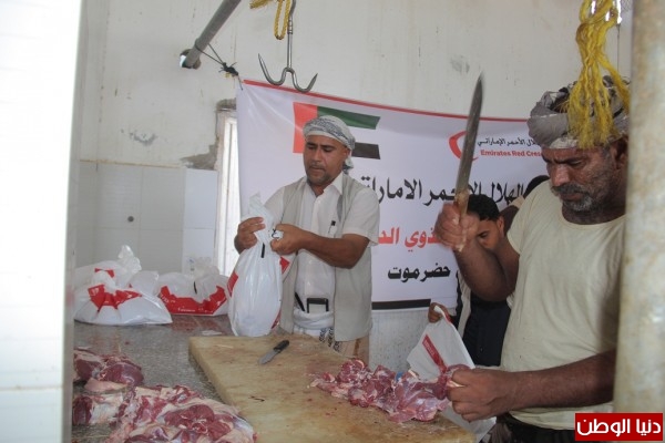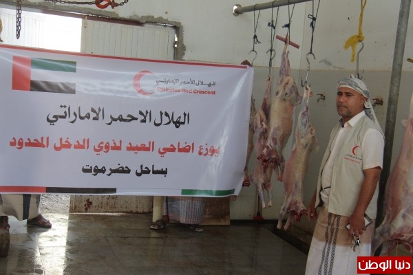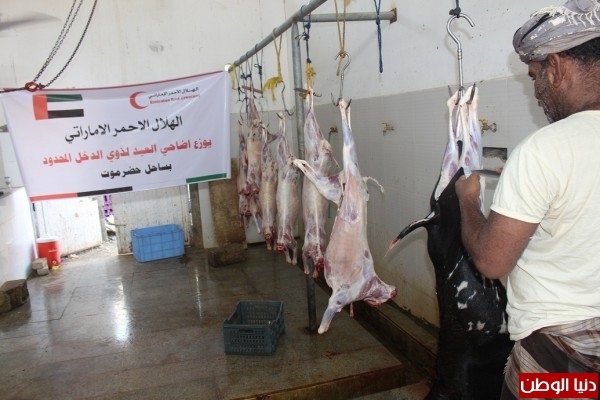 وزعت هيئة الهلال الأحمر الإماراتي أضاحي العيد في مدينة المكلا عاصمة محافظة حضرموت على الأسر الأشد فقرا من ذوي الدخل المحدود وأسر الشهداء ضمن مشاريعها الخيرية والإغاثية المتنوعة.