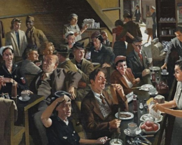 وفي العمل الفني، الذي يحمل اسم "المطعم" ورسمه الفنان الأسترالي هيربرت بادهام في عام 1944، يظهر جنود أمريكيون ومواطنون محليون في مطعم الوجبات السريعة الذي يعمل على مدار 24 ساعة.