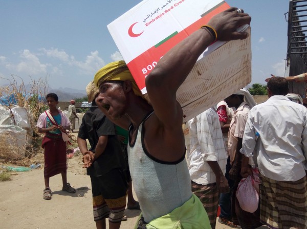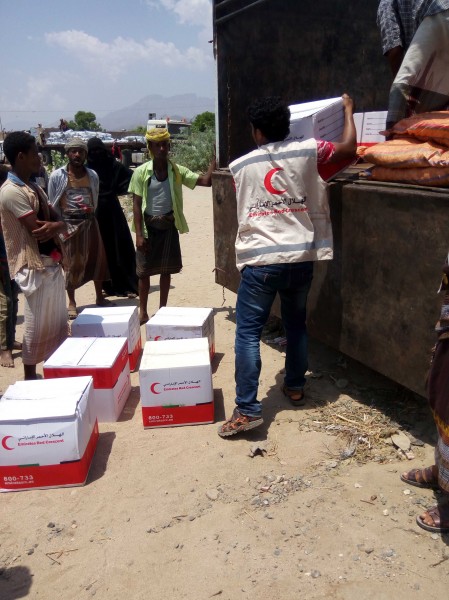 الهلال الأحمر الإماراتي يسير قافلة لنازحين تعز في طور الباحة تحتوي على خيم ايواء وسلال غذائية وادوية