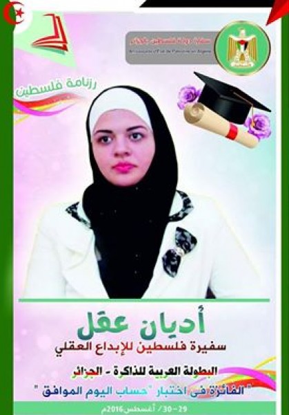 أعلنت سفارة فلسطين لدى الجمهورية الجزائرية الديمقراطية الشعبية ، عن إقامة حفل تكريم للطالبة الفلسطينية أديان عقل (18 عاما)، الفائزة بلقب البطولة العربية للذاكرة والتي أقيمت في نهاية شهر أغسطس/ آب الماضي في الجزائر.
