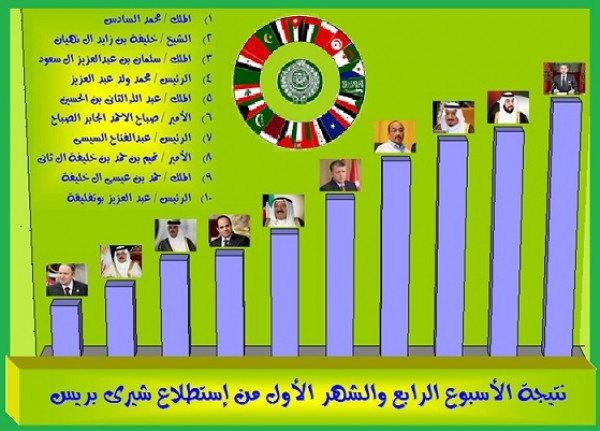 وهذا هو ترتيب العشرة زعماء العرب الأفضل شعبياً على المستوى القومى بحسب نتيجة الإستطلاع للإسبوع الرابع وللشهر الأول :