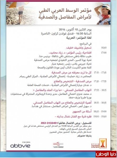 بحضور اكتر من 400 مشارك من انحاء البلاد وبمشاركة اطباء متخصصين بالروماتيزم والامراض الجلدية، وبمبادرة تطوعية من د زياد محاميد ومندوب الوسط العربي في "ايبفي" وخبير الأدوية الشاب محمد عادل زيد م تنظيم مؤتمرا طبيا بموضوع امراض الروماتيزم والصدفية في قاعه مندق الغولدين كراون في الناصرة مساء الاثنين 10/10/2016 وبمشاركة ، رئيس القائمة المشتركة النائب ايمن عودة وصحفيين وناشطين واطباء اخرين.