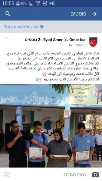 ضمن الرؤية التربوية للثانوية الشاملة كفر قاسم وتنشئة جيل نافع معطاء لبلده ومجتمعه قام هذا الأسبوع مدير المدرسة الثانوية الشاملة في كفر قاسم الاستاذ اياد عامر ومركزة مشروع التداخل الاجتماعي والتطور المعلمة عايدة عازم بتكريم ثلة من طلاب الشاملة.
