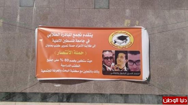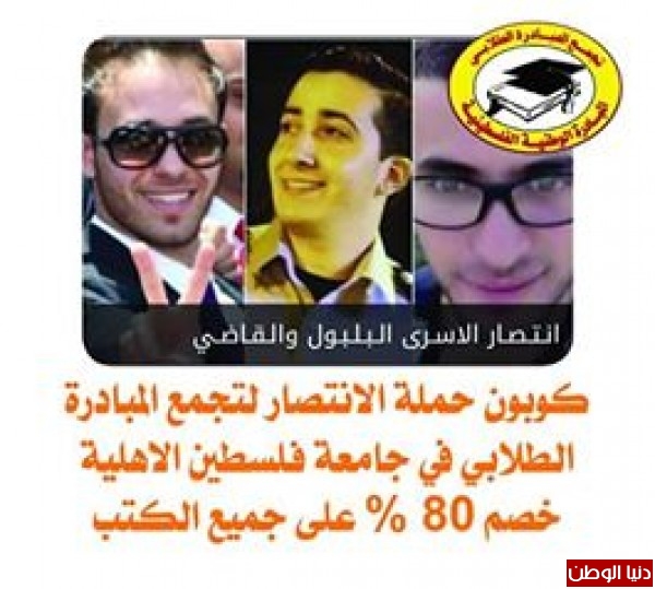 نظم تجمع المبادرة الطلابي في جامعة فلسطين الاهلية حملة تصوير على جميع الكتب الجامعية وبنسبة خصم 80% وتحت عنوان ( حملة الإنتصار للبلبول ومالك القاضي ).