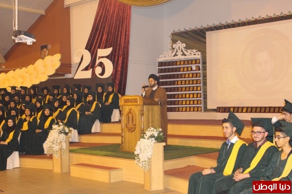 بداية، النشيد الوطني، تلاه نشيد اليوبيل الفضي للثانويتين، فدخول الخريجين، ثم عرض فيلم مصوّر عن الخرّيج المتفوق، الأول على لبنان في فرع علوم الحياة الطالب أحمد العطار الذي القى كلمة الخريجين، وجاء فيها: "من رسالة الراحل وهي رسالة مدارس المبرات، نستلم ثقافة الحوار وتقبل الآخر ونكتسب القيم الإنسانية والأخلاقية والإجتماعية بل نستلهم الفكر النقدي المعتدل لنواجه به ثلة يقتلون ويذبحون الابرياء ويشوهون صورة الإسلام بذريعة الدفاع عن الله ورسوله وكأنهم هم رسل الله وأنبياؤه".