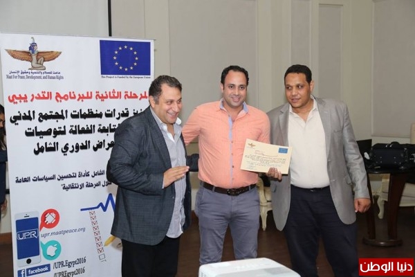 اختتمت ماعت للسلام والتنمية وحقوق الإنسان الورشة التدريبية التاسعة لمنظمات المجتمع المدني في محافظات شمال الصعيد, وذلك في إطار برنامجها التدريبي ل "تعزيز قدرات كوادر منظمات المجتمع المدني على متابعة التزامات مصر أمام آلية الاستعراض الدوري الشامل", حيث استضافت الورشة التدريبية التي استمرت على مدار يومي 29 ،30 أكتوبر 2016 ، 24 من كوادر العمل الأهلي بـ 12 منظمة أهلية من العاملين في محافظات الفيوم, بني سويف, المنيا, أسيوط, والوادي الجديد.