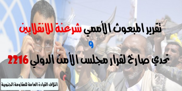 دعا ائتلاف القوى العامة للمقاومة الجنوبية المواطنين للخروج غدا الخميس للتنديد بالمبادرة الأميية التي قد مها ولد الشيخ احمد، وأستنكر الائتلاف استبعاد خارطة السلام للقضية الجنوبية التي ضحى الجنوبيين من اجلها.