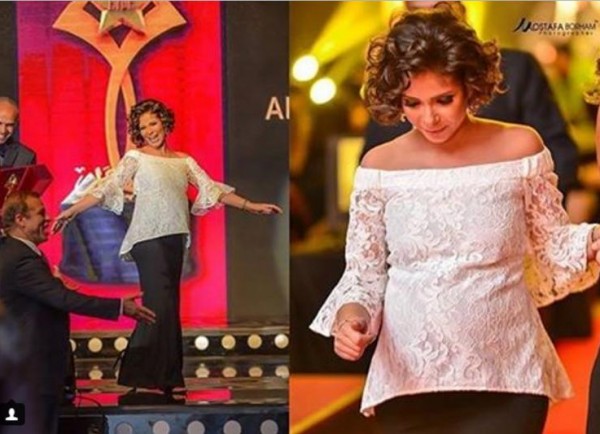 ففي هذه الإطلالة تألقت منى زكي أثناء تسلمها جائزة تكريم من مؤسسة الأهرام بفستان من قطعتين، وقد تميزت القطعة العلوية بقصة بيبلوم خفيفة أخفت بطنها البارزة بعض الشيء.