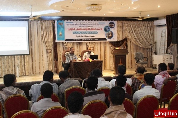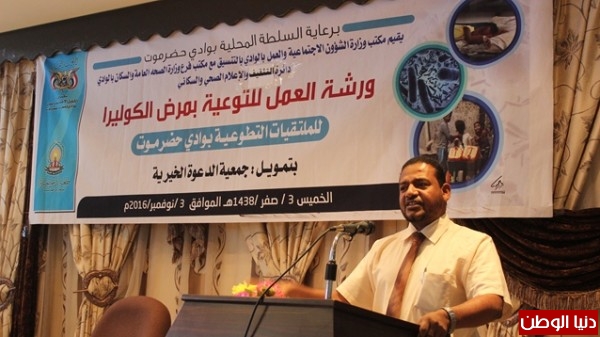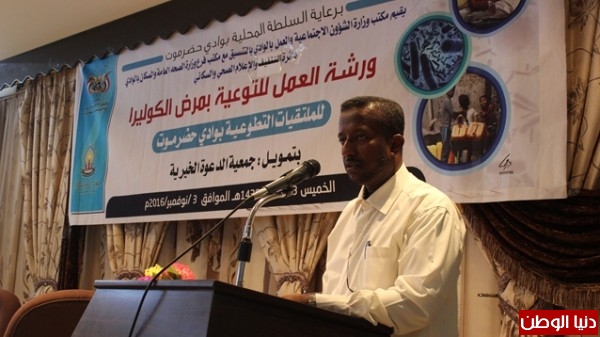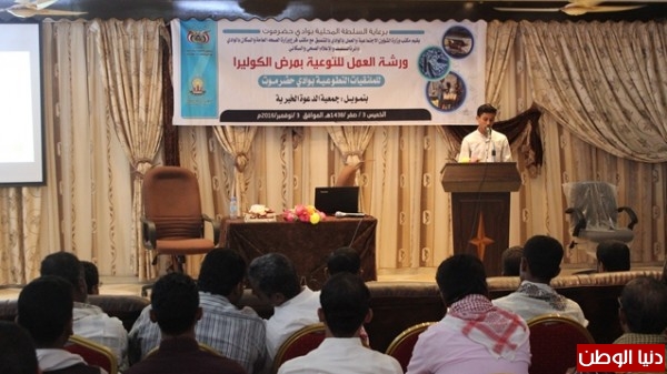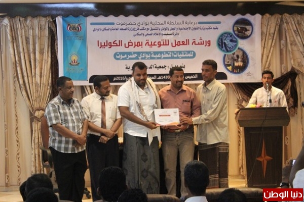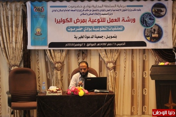 اقام مكتب الشئون الاجتماعية والعمل بالوادي والصحراء وبرعاية من السلطة المحلية بوادي حضرموت وبالتنسيق مع مكتب فرع وزارة الصحة العامة والسكان ودائرة التثقيف والاعلام الصحي والسكاني مساء أمس ورشة عمل للشباب الملتحقين بالملتقيات التطوعية بحضرموت للتوعية بمخاطر مرض الكوليرا وكيفيه معالجته والحد من انتشاره الذي بات يشكل خطراً على ابناء الجمهورية اليمنية وانتشر مؤخراً في عدة محافظات .