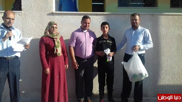 حيث بدا حفل التكربم بعد الاذاعة الصباحية وتلاوة ايات عطرة من القران الكريم والحديث النبوي الشريف من طلاب الصف الثامن ورفع العلم الفلسطيني من قبل كشافة الاسير عيسى الدرابيع ومن ثم القى مدير المدرسة كلمة رحب فيها بمشرفة التربية والتعليم وقدم الشكر الجزيل للاستاذ علي المصري على تبرعه بالجوائز كاملة للطلبه المتفوقين وشكرة على المبادرة الاصيلة التي تعبر عن الانتماء الحقيقي للمعلميين والتي تعبر عن العلاقة الابوية بين المعلم والطالب والمجتمع المحلي وبعدها تم تقديم الجوائز للطلبه المتفوقين من قبل المدير ومشرفة الرياضيات في مديرية تربية جنوب الخليل وسط التصفيق للمتفوقين