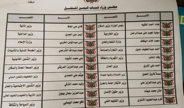 يؤدي أعضاء حكومة شباب اليمن المستقل، الاثنين القادم بصنعاء، اليمين الدستوري في مكتب رئاسة الجمهورية، عقب الإعلان عن تشكيل أسماء الحكومة، أمس بصنعاء.