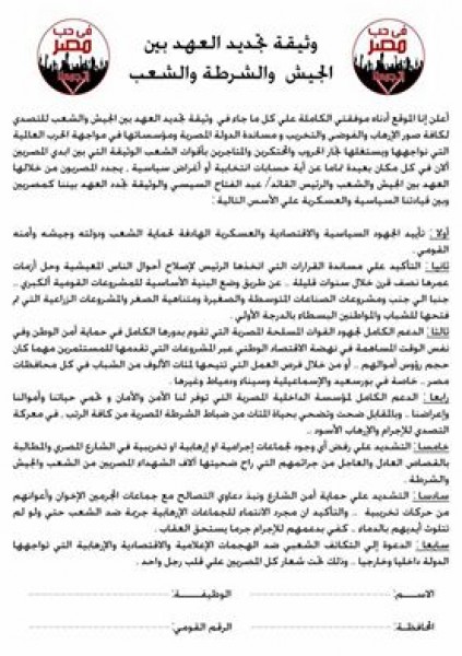 ومن المنتظر أن يتم الاعلان عن وثيقة تجديد العهد و الاعلان عن المؤيدين للوثيقة في حضور جميع الأحزاب والقوي السياسية والمجتعية في محافظة الشرقية.