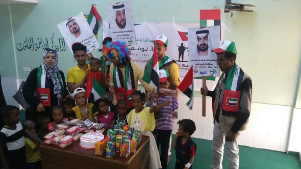 وأشرف الهلال الأحمر الإماراتي على توزيع الإعلام والإماراتية والقبعات التي رسم عليها صور الشيخ خليفة بن زايد، وشعار الاتحاد والبالونات للأطفال المصابين بمرض السرطان.