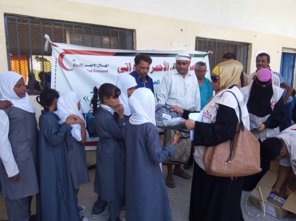 الهلال الإماراتي يوزع 200 حقيبة و400 كراسة بلحج