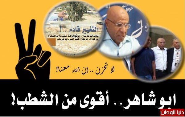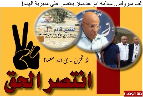 صحيح اننا ربحنا المحكمة اليوم ولكن امامنا الانتصار للتغيير في الانتخابات، وما زلت اتألم واتذكر هدم بيوت عائلة ابو مريحيل وتشريد العائلات والاطفال الابرياء من قبل هذه المديرية الظالمة، ولا بد لنا من العمل معاً متحدين لدحر الظلم عن اهلنا في كافة القرى العربية في النقب، واذا اختار السكان دعمي لرئاسة المجلس فسوف اكون على العهد وحفظ الامانة ان شاء الله".