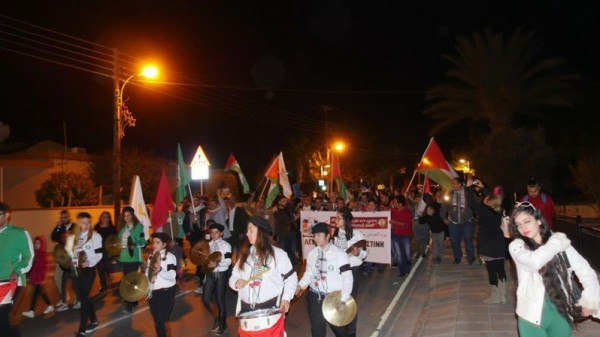 ولقد جابت مسيرة حاشدة في المدينة يتقدمها فرقة من الكشافة بالطبول والاعلام والشالات الفلسطينية والقبرصية .